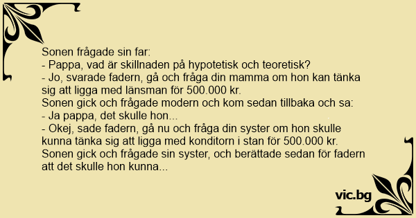 Sohn zum Vater: "Papa, was ist der Unterschied zwischen Theorie und Praxis?" Иванчо пита баща си : Jantje komt bij papa en vraagt hem: Papa wat is het verschil tussen “in principe” en “in feite”? Papa denkt na en zegt: ‘Ga naar je moeder en vraag of zij voor 1 miljoen met de buurman naar bed zou... Jantje: Papa, wat is het verschil tussen "in feite" en "in principe"? Papa: Om je dat goed uit te leggen moet je eerst aan mama vragen of ze voor € 500.000 met de buurman naar bed zou willen.... Le fils cadet demande à son père : Papa, c'est quoi la différence entre "hypothétiquement" et "réellement" ? - Viens t'asseoir, mon fils, je vais te parler. Le père se tourne vers sa femme : -... Jantje komt thuis van school en zijn vader vraagt: "Hoe was het vandaag op school Jantje?" "Nou" zegt Jantje, "de meester had het over 'theorie versus praktijk' en ik snapte er niets van." Vader... Kommt Klein-Fritzchen zum Vater: "Du Papa, was ist denn der Unterschied zwischen theoretisch und praktisch?" Meint der Papa: "Bevor ich dir darauf antworte gehst du erst mal zu deiner Mutter und... Jantje en zijn vader zitten samen achter de TV ineens vraagt Jantje: “Papa, wat is eigenlijk het verschil tussen in principe en een feit?” waarop zijn vader antwoordt: “Ga maar aan je moeder vragen... Un adolescent demande à son père : - Papa qu'est est la différence entre réellement et potentiellement ? Le père : - Va demander à ta soeur et à ta mère si elles veulent coucher avec le voisin.... A young lad is sitting at the table doing his homework. Dad, he says, "What is the difference between 'potentially' & 'realistically'"? Father scratches his chin, inhales sharply and says,"That's... Pistike odamegy az apjához, és megkérdezi: - Apa, mi a különbség aközött, hogy "elméletileg" és "gyakorlatilag"? Erre az apja odamegy az anyósához, és azt kérdezi: - Mondja, Mama, mit csinálna, ha... Jantje vraagt aan zijn vader, pa wat is het verschil tussen in principe en in feite. Wel zegt pa, ik zal u daar op antwoorden maar dan moet je eerst aan je mama gaan vragen of ze voor 1000.000 euro... Esto es Jaimito y le pregunta asu padre: - Papá, papá, ¿es lo mismo la ficción y la realidad? - No hijo, verás, pregúntale a tu hermana si se acostaria con un hombre por 1.000.000$. Le dijo su...