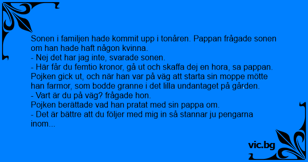 Sonen i familjen hade kommit upp i tonåren. Pappan frågade sonen om han hade haft någon kvinna.