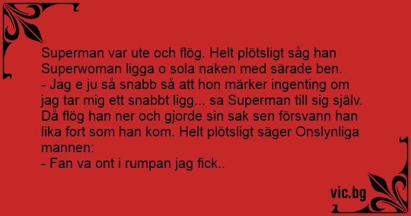 Superman var ute och flög. Helt plötsligt såg han Superwoman ligga o sola naken med särade ben.