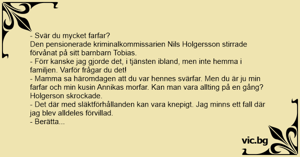 - Mamma sa häromdagen att du var hennes svärfar. Men du är ju min farfar och min kusin Annikas morfar. Kan man vara allting på en gång?