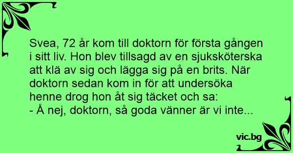 Svea, 72 år kom till doktorn för första gången i sitt liv. Hon blev tillsagd av en sjuksköterska att klä av sig och lägga sig på en brits. När doktorn sedan kom in för att undersöka henne drog hon åt sig täcket och sa:
