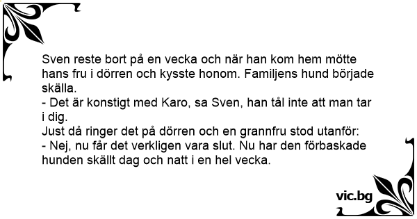 Sven reste bort på en vecka och när han kom hem mötte hans fru i dörren och kysste honom. Familjens hund började skälla.