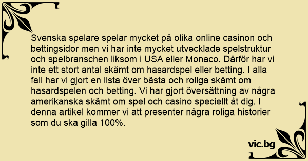 Svenska spelare spelar mycket på olika online casinon och bettingsidor men vi har inte mycket utvecklade spelstruktur och spelbranschen liksom i USA eller Monaco. Därför har vi inte ett stort antal skämt om hasardspel eller betting. I alla fall har vi gjort en lista över bästa och roliga skämt om hasardspelen och betting. Vi har gjort översättning av några amerikanska skämt om spel och casino speciellt åt dig. I denna artikel kommer vi att presenter några roliga historier som du ska gilla 100%.