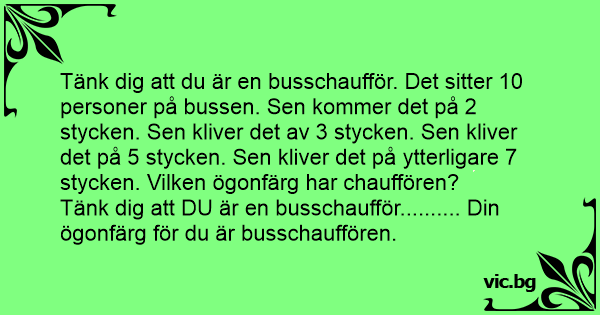 Tänk dig att du är en busschaufför. Det sitter 10 personer på bussen. Sen kommer det på 2 stycken. Sen kliver det av 3 stycken. Sen kliver det på 5 stycken. Sen kliver det på ytterligare 7 stycken. Vilken ögonfärg har chauffören?
