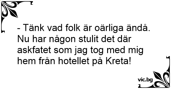 - Tänk vad folk är oärliga ändå. Nu har någon stulit det där askfatet som jag tog med mig hem från hotellet på Kreta!