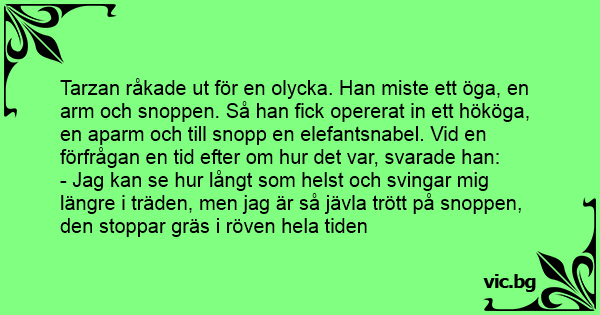 Tarzan havde engang mistet en arm et øje og sin penis. Derfor gik han til doktoren og spurgte hvad han skulle gøre. Så gav doktoren ham bare en abe arm et ørne øje og et elefant snabel. 2 uger...
