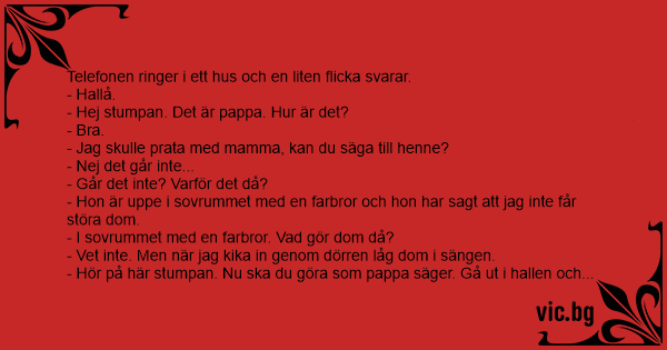 - Ало? - Здравей, миличко, обажда се татко. Мама близо до телефона ли е? - Не, тате. Тя е горе в спалнята с чичо Гошо. След кратка пауза таткото казва: - Но ти нямаш чичо с име Гошо, миличко! - О, да, имам и той е горе в спалнята с мама в момента! - Ъ, добре тогава... ето какво искам да направиш....