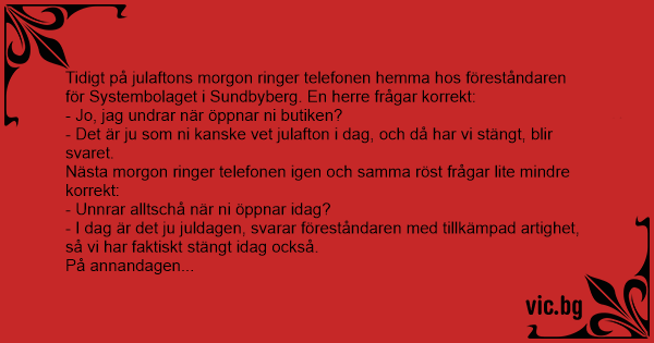 - Det är ju som ni kanske vet julafton i dag, och då har vi stängt, blir svaret.