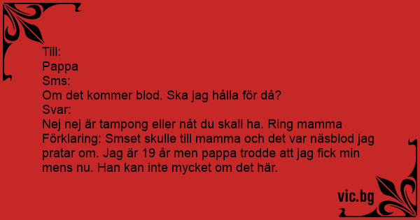 Förklaring: Smset skulle till mamma och det var näsblod jag pratar om. Jag är 19 år men pappa trodde att jag fiск min mens nu. Han kan inte mycket om det här.