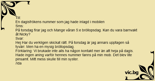 Förklaring: Vi brukade inte alls ha någon kontakt mer än att heja på dagis. Hade ingen aning varför hennes nummer fanns på min mob. Det blev lite pinsamt. Mitt mess skulle till min syster.