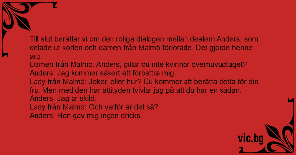 Till sluт berättar vi om den roliga dialogen mellan dealern Anders, som delade ut korten och damen från Malmö förlorade. Det gjorde henne arg.