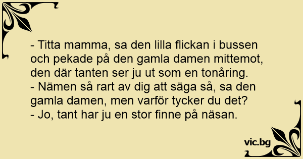 - Titta mamma, sa den lilla flickan i bussen och pekade på den gamla damen mittemot, den där tanten ser ju ut som en tonåring.