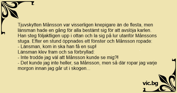 Tjuvskytten Månsson var visserligen knepigare än de flesta, men länsman hade en gång för alla bestämt sig för att avslöja karlen. Han steg följaktligen upp i ottan och la sig på lur utanför Månssons stuga. Efter en stund öppnades ett fönster och Månsson ropade: