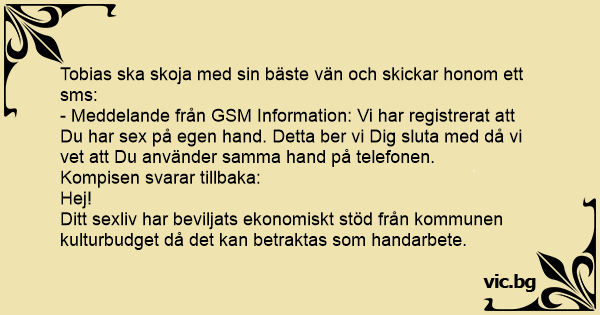 - Meddelande från GSM Information: Vi har registrerat att Du har sеx på egen hand. Detta ber vi Dig sluta med då vi vet att Du använder samma hand på telefonen.