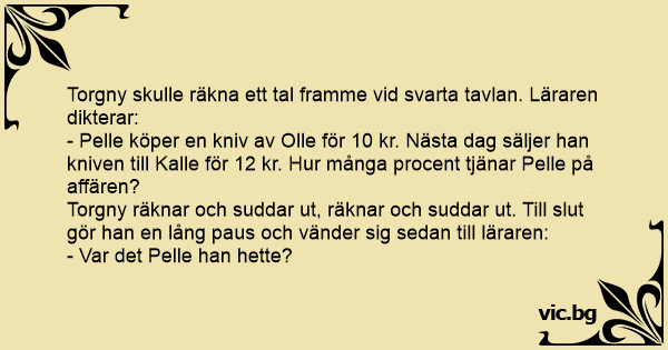 - Pelle köper en kniv av Olle för 10 kr. Nästa dag säljer han kniven till Kalle för 12 kr. Hur många procent tjänar Pelle på affären?