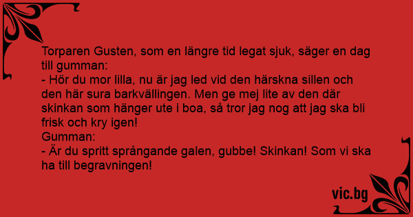 - Hör du mor lilla, nu är jag led vid den härskna sillen och den här sura barkvällingen. Men ge mej lite av den där skinkan som hänger ute i boa, så tror jag nog att jag ska bli frisk och kry igen!