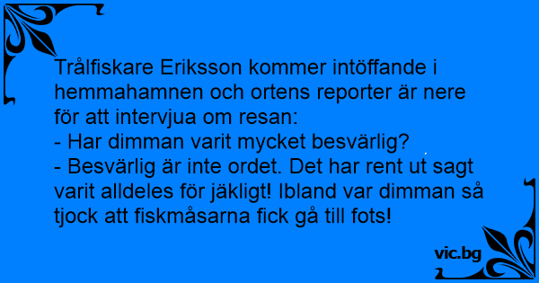 - Besvärlig är inte ordet. Det har rent ut sagt varit alldeles för jäkligt! Ibland var dimman så tjock att fiskmåsarna fiск gå till fots!