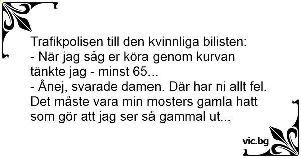 - Ånej, svarade damen. Där har ni allt fel. Det måste vara min mosters gamla hatt som gör att jag ser så gammal ut...