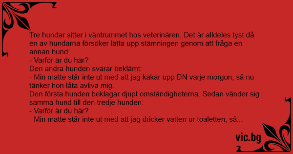 Det hela utspelar sig i veterinärens väntrum. 2 hundar, en pudel och en dobbermann sitter och väntar på att få komma in till veterinären och de börjar prata med varandra. - Varför är du här, säger...