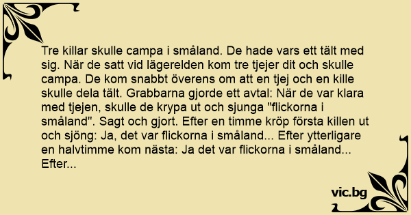 Tre killar skulle campa i småland. De hade vars ett tält med sig. När de satt vid lägerelden kom tre tjejer dit och skulle campa. De kom snabbt överens om att en tjej och en kille skulle dela tält. Grabbarna gjorde ett avtal: När de var klara med tjejen, skulle de krypa ut och sjunga "flickorna i småland". Sagt och gjort. Efter en timme kröp första killen ut och sjöng: Ja, det var flickorna i småland... Efter ytterligare en halvtimme kom nästa: Ja det var flickorna i småland... Efter ytterligare en timme var det fortfarande tyst i det tredje tältet. Grabbarna blev nervösa om det hänt något. Men en kvart senare hörde dom från tältet: På lingonröda tuvor...