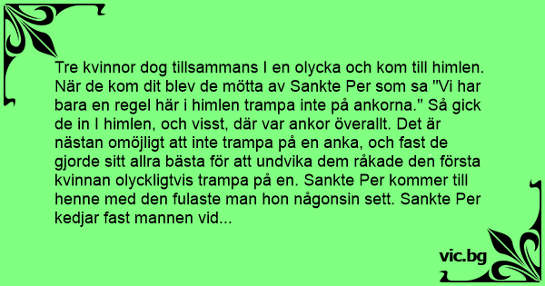Tre kvinnor dog tillsammans I en olycka och kom till himlen. När de kom dit blev de mötta av Sankte Per som sa "Vi har bara en regel här i himlen trampa inte på ankorna." Så gick de in I himlen, och visst, där var ankor överallt. Det är nästan omöjligt att inte trampa på en anka, och fast de gjorde sitt allra bästa för att undvika dem råkade den första kvinnan olyckligtvis trampa på en. Sankte Per kommer till henne med den fulaste man hon någonsin sett. Sankte Per kedjar fast mannen vid hennes sida och säger "Ditt straff för att du trampade på en anka är att tillbringa evigheten fastkedjad vid denna fula man!" Nästa dag råkade den andra kvinnan trampa på en anka och direkt kom Sankte Per, som inte missar någonting, och med sig hade han en extremt ful man. Han kedjar fast dem tillsammans med samma förklaring som till den första kvinnan. Den tredje kvinnan har observerat allt detta och är, eftersom hon inte vill bli fastkedjad i evighet med en ful man, mycket, MYCKET försiktig med var hon sätter fötterna. Hon lyckas att gå i flera månader utan att trampa på en enda anka, men en dag kommer Sankte Per fram till henne med den snyggaste man hon någonsin sett. Lång, långa ögonfransar, muskulös och smal. Sankte Per kedjar fast dem vid varandra utan att säga ett ord. Kvinnan kommenterar det hela "Jag undrar vad jag har gjort för att förtjäna att vara fastkedjad med dig i all evighet?" Killen svarar, "Jag vet inte hur det är med dig, men jag trampade på en anka!"