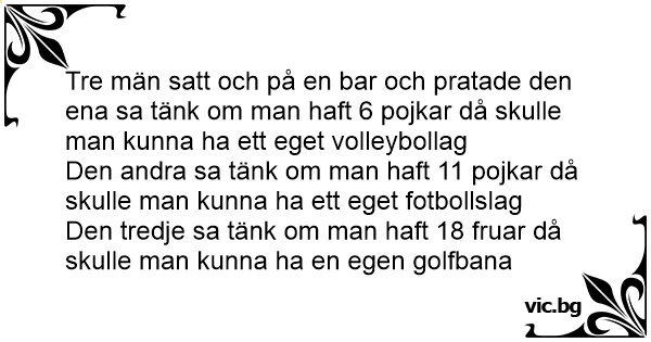 Tre män satt och på en bar och pratade den ena sa tänk om man haft 6 pojkar då skulle man kunna ha ett eget volleybollag