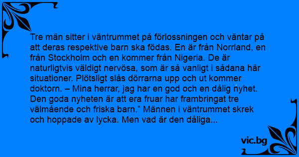 Tre män sitter i väntrummet på förlossningen och väntar på att deras respektive barn ska födas. En är från Norrland, en från Stockholm och en kommer från Nigeria. De är naturligtvis väldigt nervösa, som är så vanligt i sådana här situationer. Plötsligt slås dörrarna upp och ut kommer doktorn. – Mina herrar, jag har en god och en dålig nyhet. Den goda nyheten är att era fruar har frambringat tre välmående och friska barn.” Männen i väntrummet skrek och hoppade av lycka. Men vad är den dåliga nyheten, frågar stockholmaren.