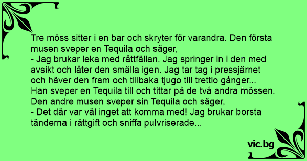 Tre möss sitter i en bar och skryter för varandra. Den första musen sveper en Tequila och säger,