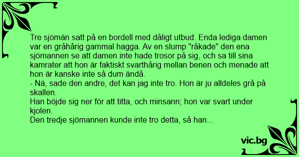 Tre sjömän satt på en bordell med dåligt utbud. Enda lediga damen var en gråhårig gammal hagga. Av en slump "råkade" den ena sjömannen se att damen inte hade trosor på sig, och sa till sina kamrater att hon är faktiskt svarthårig mellan benen och menade att hon är kanske inte så dum ändå.