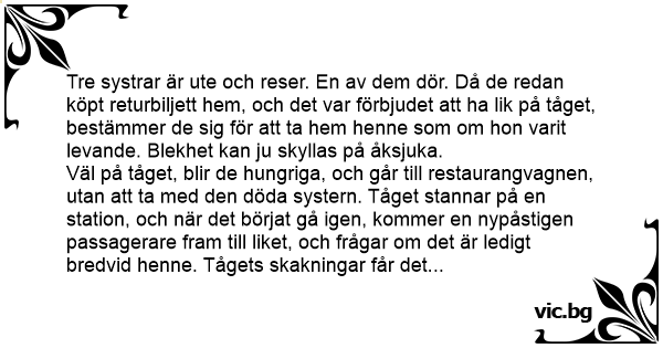 Väl på tåget, blir de hungriga, och går till restaurangvagnen, utan att ta med den döda systern. Tåget stannar på en station, och när det börjat gå igen, kommer en nypåstigen passagerare fram till liket, och frågar om det är ledigt bredvid henne. Tågets skakningar får det att se ut som om hon nickar.