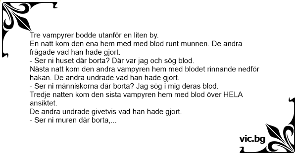 The Bat Bet Chiste del vampiro con sangre en la cara El chiste de los vampiros Drei Vampire haben Hunger Drei Vampire auf der Mauer. Der erste fliegt los und kommt mit blutverschmiertem Gesicht zurück. „Mmh, die alten Leute… im Altenheim schmecken so gut…“ Fliegt der zweite los und kommt ebenfalls mit... Bir İngiliz vampir, bir Fransız vampir, bir de Temel vampir Uçakta gidiyorlarmış. Bir sure sonra İngiliz vampir aralarından ayrılmış, aşağılara dalmis. Bir sure sonra geri gelmiş ki, ağzı... Det var en gång tre vampyrer som skulle tävla om vem som kunde hitta mest blod att dricka. Vampyr nr 1 flög i väg och kom tillbaka med blodiga tänder: - Vart fick du det blodet ifrån? - Ser ni... Drakula hade skickat ut tre vampyrer för att se vem av dom som kunde samla ihop mest blod. Den första som kom tillbaka hade med sig två droppar blod. Han sa: - Ser ni bondgården där borta, där sög... Había 2 vampiros. Uno estaba bañado en sangre y el otro le pregunta: - ¿De dónde sacaste tanta sangre? - ¿Ves aquella pared de allí? - Sí. - ¡Pues yo no la vi!Vales Amazon en Rebajas.Guru Un vampiro llega a su casa con la boca llena de sangre, y su mamá le pregunta: - ¿Dónde conseguiste eso tan rico?. Y él responde: - ¿Ves ese muro que está allá? - Si - Bueno, pues yo no lo vi. Det var en gang tre vampyrer som skulle få tak i mest blod. Den første kom tilbake med blod på tennene og sa: – Ser dere det huset der, der fikk jeg tak i det blodet. Den andre kom tilbake med blod... Tre vampyrer vaknade och var jättetörstiga på blod. Den ena flög blixtsnabbt iväg och kom tillbaka efter 10 minuter med hela ansiktet fullt med blod. – Var har du varit? – Ser ni den där bondgården... Un vampiro llega con toda la boca rebosante de sangre a donde estaba otro, y éste le dice: - Oye viejo, dime, ¿Dónde conseguiste toda esa rica sangre? El otro le respondió: - Bueno, ¿Ves ese muro... Erau odata trei vampiri carora le era foame. Se duce primu' si se intoarce cu gura plina de sange..... Ceilalti il intreaba: - Ba, de unde ai luat sange? - Vedeti turma aia de oi? - Da! - Am... O pai vampiro estava ensinando seus filhos vampiros a chupar sangue: O primeiro vem a ele com a boca cheia de sangue e diz: — Pai você esta vendo aquela vaca ali? Chupei todo o sangue dela! O... Den äldsta av de tre vampyrbröderna kom hem en natt med ett leende kantat av blod. - Åh! utbrast hans bröder, var har du varit? - Ser ni ljuset från staden där borta? Där har jag varit i natt och... Två vampyrer var ute och letade efter mat, och efter en stund bestämde de sig för att skiljas åt och träffas senare. När de möttes igen hade ena vampyren munnen full med blod, så den andra vampyren... Hay dos vampiros y unos le dice al otro: -¿ De dónde has sacado esa sangre? -¿ Ves esa pared? - Sí. - Pues yo no la ví Sitzen drei Vampire kurz nach Mitternacht auf der Mauer. Sagt der erste: „Oh man, ich hab Hunger und brauch‘ Blut!“ Er fliegt los und kommt nach zehn Minuten wieder zurück – um den Mund voller...