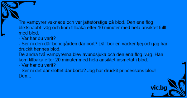 Tre vampyrer bodde utanför en liten by. En natt kom den ena hem med med blod runt munnen. De andra frågade vad han hade gjort. - Ser ni huset där borta? Där var jag och sög blod. Nästa natt kom den andra vampyren hem med blodet rinnande nedför hakan....