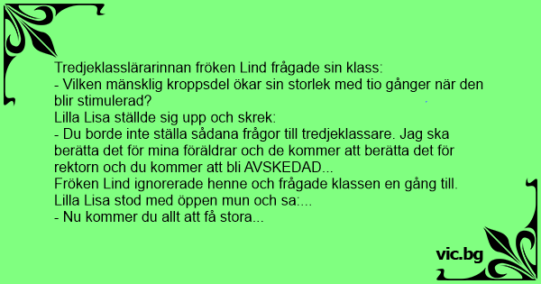 - Du borde inte ställa sådana frågor till tredjeklassare. Jag ska berätta det för mina föräldrar och de kommer att berätta det för rektorn och du kommer att bli AVSKEDAD...