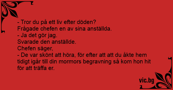 Το αφεντικό στον υπάλληλό του - Редник Петров, при мен! "Glauben Sie an ein Leben nach dem Tode?" fragt der Boss seinen Angestellten. "Ja, natürlich." - "Ah, dann ist ja alles in Ordnung. Denn kurz nachdem Sie gestern zum Begräbnis Ihrer Großmutter gingen, kam diese vorbei, um Sie zu besuchen..." - Jasiu - mówi pani nauczycielka - czy wierzysz w życie pozagrobowe? - Nie. Dlaczego?! - Bo przed szkołą stoi twój dziadek, na którego pogrzeb zwolniłeś się wczoraj z lekcji.