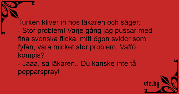Muhammed till läkaren: ”Varje gång jag har sex med dansk tjej får jag ont i ögnen” Ja, säger läkaren, du är nog känslig mot pepparspray.