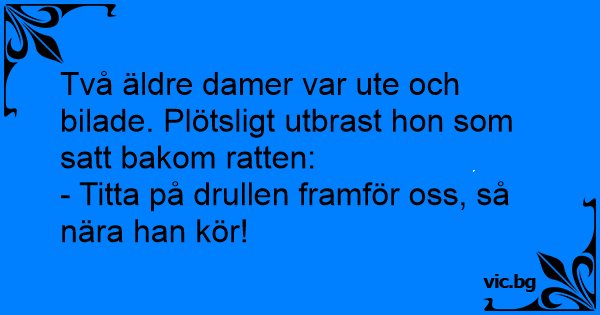 Två äldre damer var ute och bilade. Plötsligt utbrast hon som satt bakom ratten: