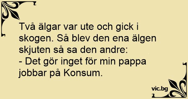 Två älgar var ute och gick i skogen. Så blev den ena älgen skjuten så sa den andre: