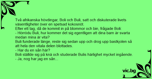 Två afrikanska hövdingar, Boli och Buli, satt och diskuterade livets väsentligheter över en spetsad kokosnöt.