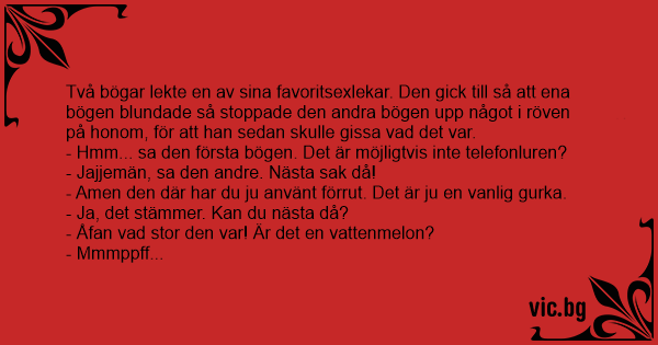 Två bögar lekte en av sina favoritsexlekar. Den gick till så att ena bögen blundade så stoppade den andra bögen upp något i röven på honom, för att han sedan skulle gissa vad det var.