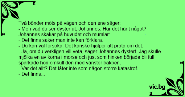 - Ja, om du verkligen vill veta, säger Johannes dystert. Jag skulle mjölka en av korna i morse och just som hinken började bli full sparkade hon omkull den med vänster bakben.