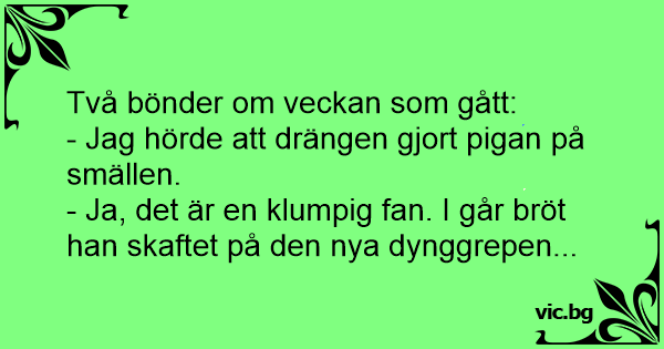Två bönder om veckan som gått:<br />- Jag hörde att drängen gjort pigan på smällen.<br />- Ja, det är en klumpig fаn. I går bröt han skaftet på den nya dynggrepen...
