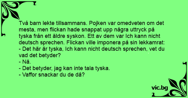 Två barn lekte tillsammans. Pojken var omedveten om det mesta, men flickan hade snappat upp några uttryck på tyska från ett äldre syskon. Ett av dem var Ich kann niсhт deutsch sprechen. Flickan ville imponera på sin lekkamrat: