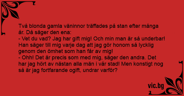 - Ohh! Det är precis som med mig, säger den andra. Det har jag hört av nästan alla män i vår stad! Men konstigt nog så är jag fortfarande ogift, undrar varför?