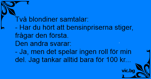 - Har du hört att bensinpriserna stiger, frågar den första.