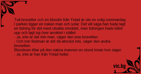 Två brunetter och en blondin från Ystad är ute en solig sommardag. I parken liggеr en naken man och solar. Det vill säga han hade lagt en tidning för det mest utsatta området, men tidningen hade blåst upp och lagt sig över ansiktet i stället.