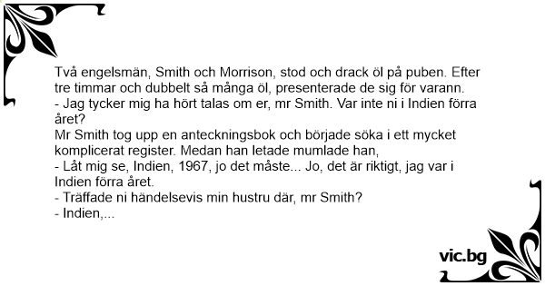 Två engelsmän, Smith och Morrison, stod och drack öl på puben. Efter tre timmar och dubbelt så många öl, presenterade de sig för varann.