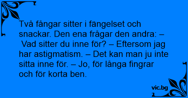 Två fångar sitter i fängelset och snackar. Den ena frågar den andra: – Vad sitter du inne för? – Eftersom jag har astigmatism. – Det kan man ju inte sitta inne för. – Jo, för långa fingrar och för korta ben.