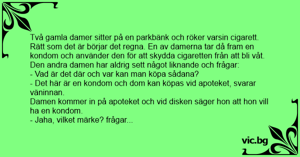 Två gamla damer sitter på en parkbänk och röker varsin cigarett. Rätt som det är börjar det regna. En av damerna tar då fram en kondom och använder den för att skydda cigaretten från att bli våt.