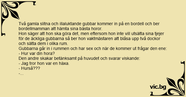 Två gamla slitna och illaluktande gubbar kommer in på en bordell och ber bordellmamman att hämta sina bästa horor.