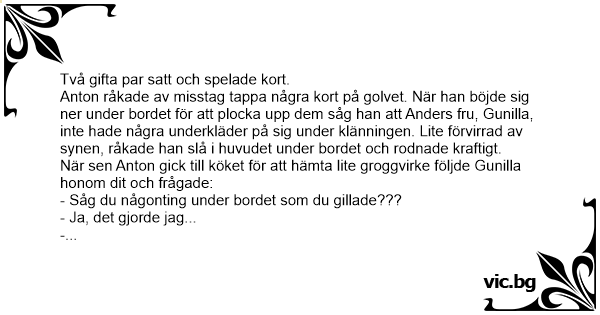Anton råkade av misstag tappa några kort på golvet. När han böjde sig ner under bordet för att plocka upp dem såg han att Anders fru, Gunilla, inte hade några underkläder på sig under klänningen. Lite förvirrad av synen, råkade han slå i huvudet under bordet och rodnade kraftigt.
